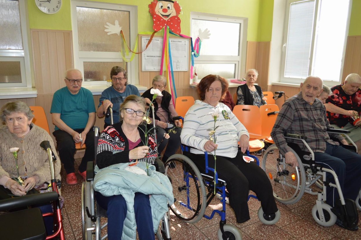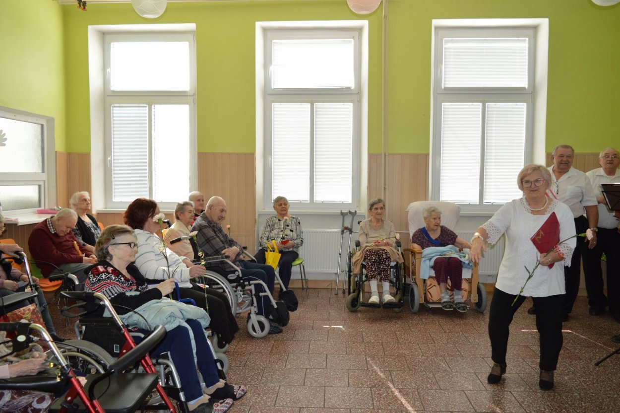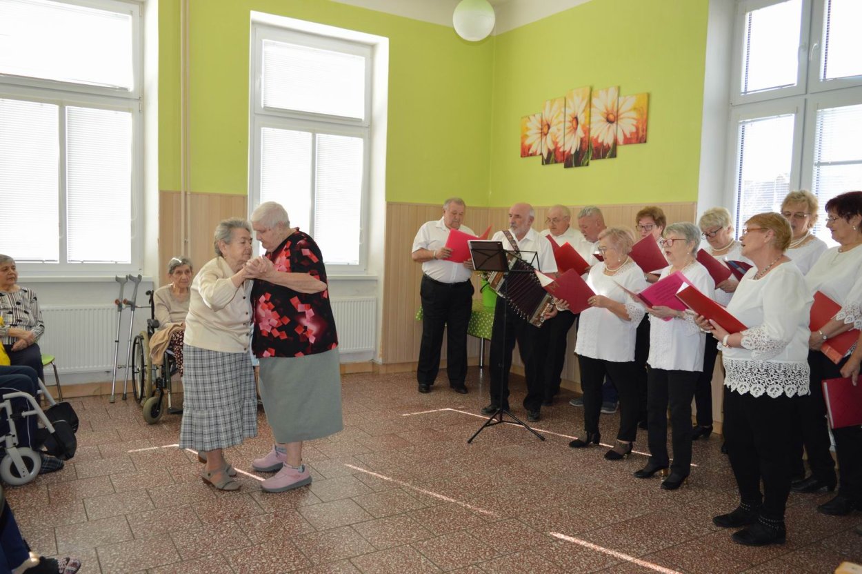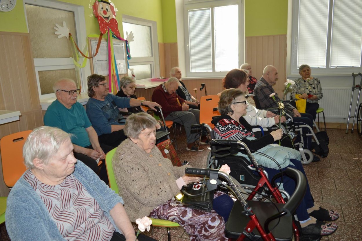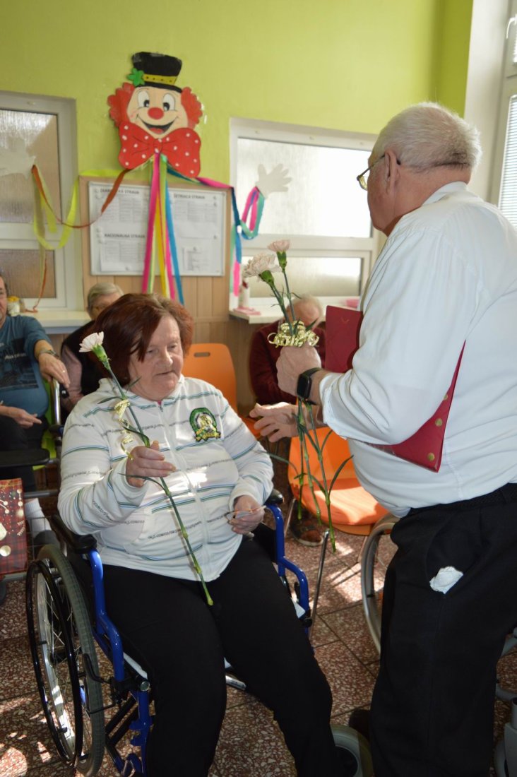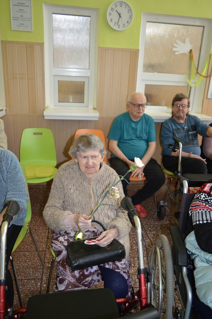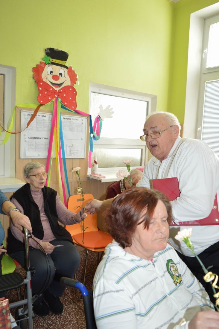Aj tento rok sme si začiatkom marca v našom zariadení nezabudli pripomenúť krásny sviatok - Medzinárodný deň žien. Všetkých prítomných na úvod vystúpenia privítala a pozdravila vedúca sociálno-zdravotného úseku Martina. Pekným pásmom piesní a básní prišli v tento sviatočný deň pozdraviť našich klientov členovia spevokolu Fialôčka z Poltára. K spievaniu sa po krátkej chvíli pridali aj naše klientky a trošku sa v tanci vyzvŕtali aj aj pani Milka s Elenkou. Po speve a tanci sa chlapi zo spevokolu činili a všetkých prítomným klientkam aj členkám spevokolu ako prejav úcty odovzdali krásne karafiáty. Nezabudli sme ani na imobilné klientky, ktorým tiež Martina s inštruktorkou Jankou odovzdali kvietky v súkromí ich izieb. Bolo to veľmi milé a veselé stretnutie a posedenie so spevom, ktoré opäť vyčarilo na tvárach našich žien a aj všetkých prítomných krásne úsmevy.