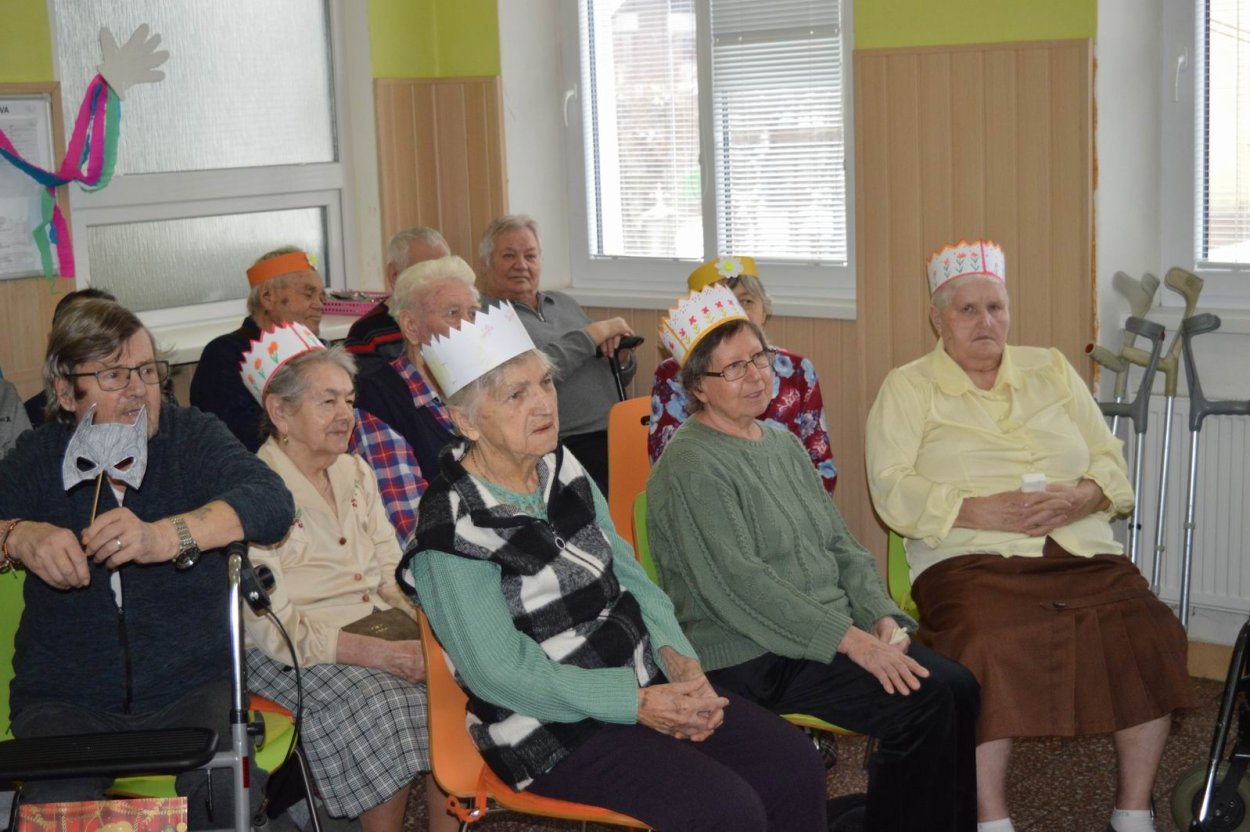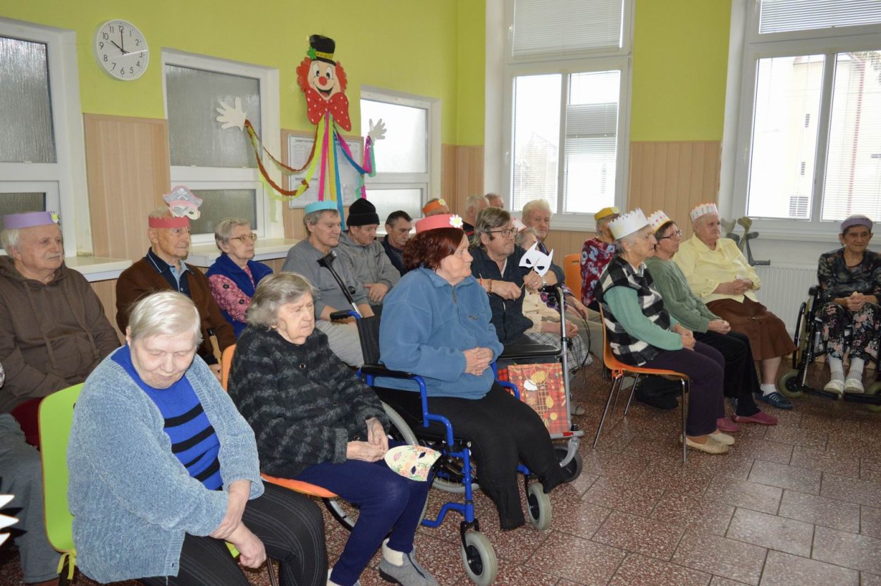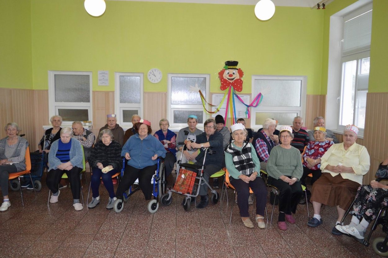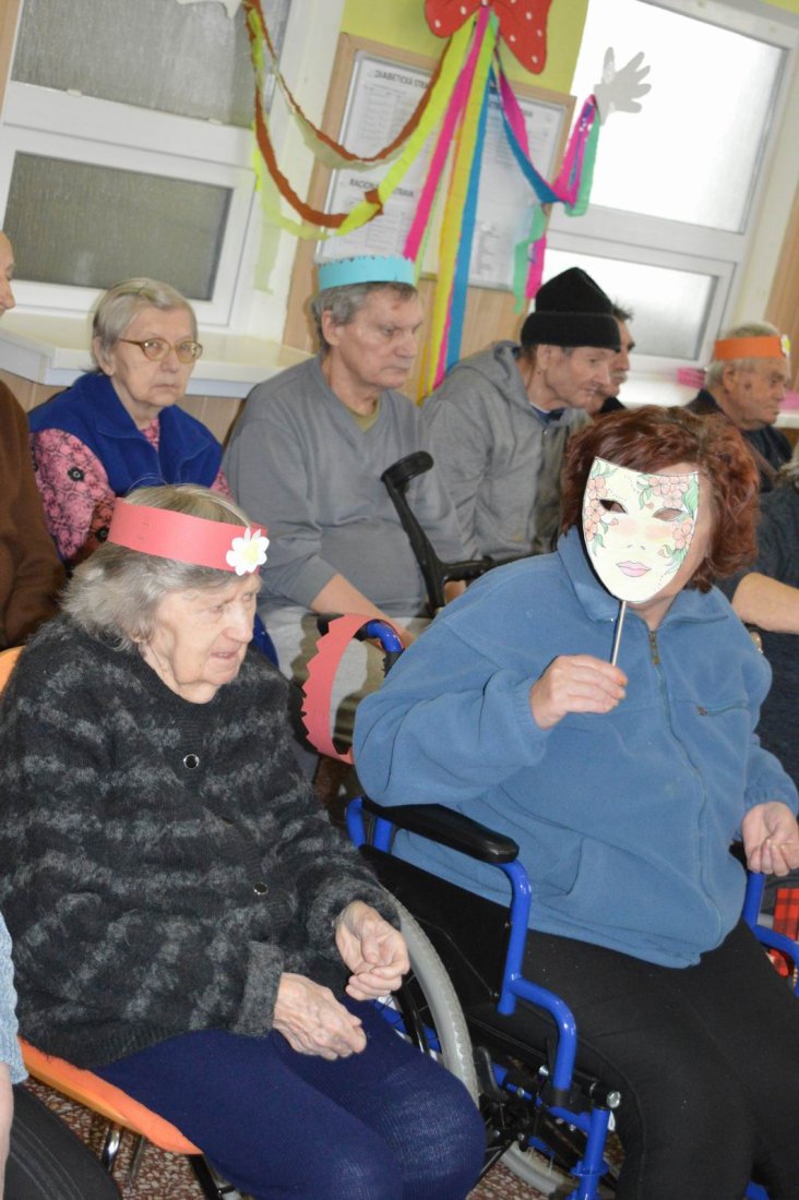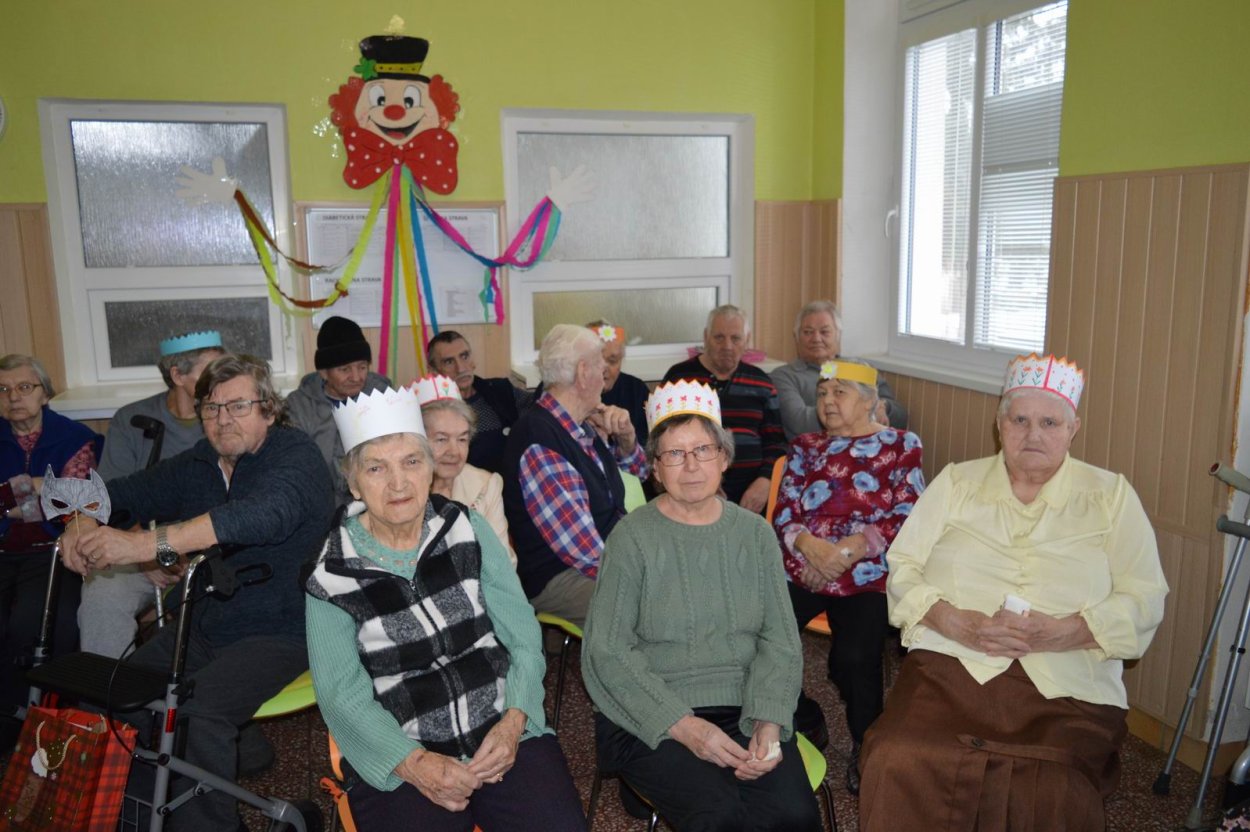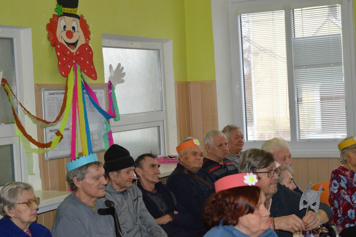 „Fašiangy, Turíce, Veľká noc príde, kto nemá kožúška zima mu bude....“ Toto piesňou sme začali naše fašiangové stretnutie. Naše pozvanie prijali a o dobrú náladu sa postarali členovia spevokolu Fialôčka z Poltára. Sociálna pracovníčka Anka v príhovore spomenula zvyky a tradície, ktoré boli typické pre toto veselé obdobie roka a ako fašiangy prebiehali kedysi na dedinách a v mestách. Našich klientov milým slovom pozdravila aj vedúca spevokolu pani Mária Királyová. A potom za zvukov heligónky spievali nielen členovia spevokolu, ale aj naši klienti, ktorí si už vopred pripravili na toto posedenie fašiangové korunky a masky. Neostalo iba pri speve, niektorí si veru aj zatancovali. Neskôr hral heligonkár pesničky podľa želania klientov a my ostatní sme sa so spevom radi pridali. Na záver stretnutia sme si pripomenuli koniec fašiangov veršom „Fašiangy sa krátia, už sa nenavrátia, staré dievky plačú, že sa nevyskáču...“