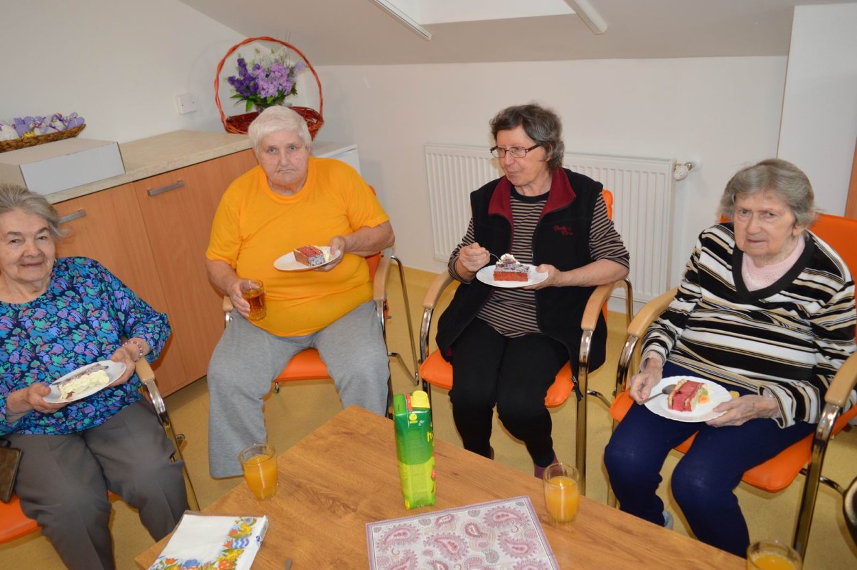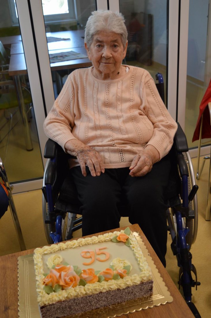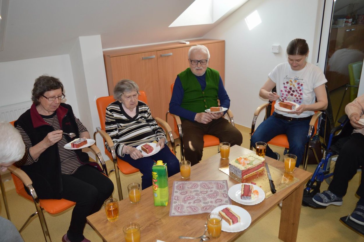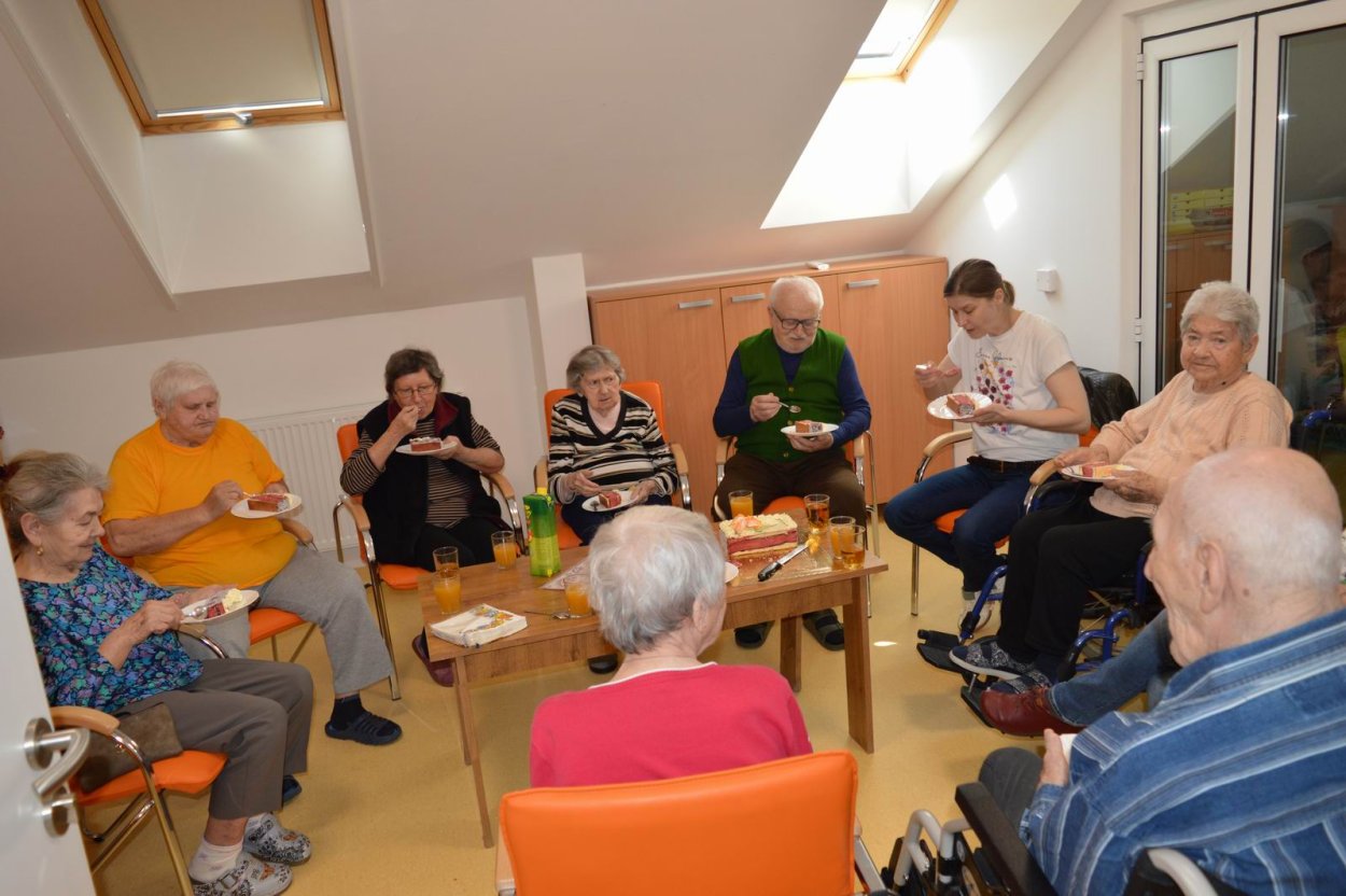 V polovici apríla sme v našom zariadení opäť oslavovali, pretože sa pani Anička dožila úctyhodných 95.narodenín. Narodeninovú oslavu pani Aničke spoločne zorganizovali jej dcéra s vnučkou žijúce v Rakúsku za asistencie sociálnej pracovníčky Anky. Pani Anička pozvala na malé narodeninové posedenie aj svojho brata Rudka, ktorý v deň stretnutia oslavoval svoje meniny. Pozvanie prijali aj priateľky zo zariadenia a vedúca sociálno-zdravotného úseku. Na úvod spoločného narodeninového posedenia milým slovom aj vinšom sa oslávenkyni prihovorila sociálna pracovníčka Anka. Dcéra s vnučkou priniesli oslávenkyni výbornú punčovú tortu, ktorá nielen fantasticky vyzerala, ale tak aj všetkým chutila.