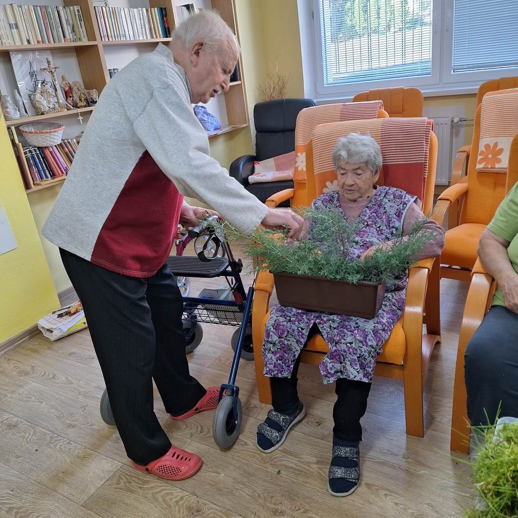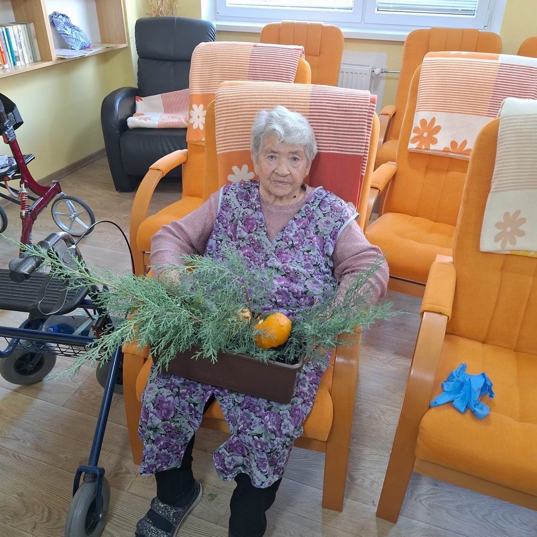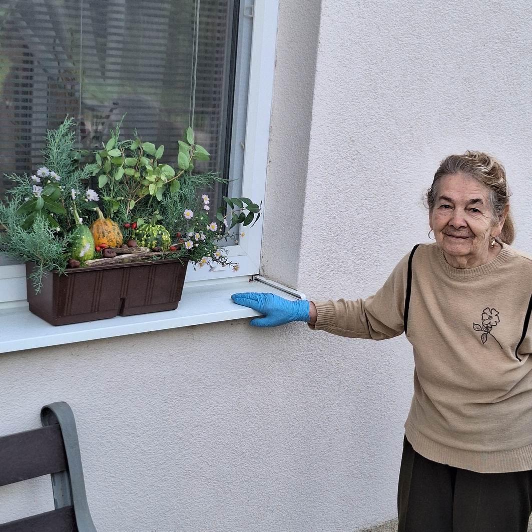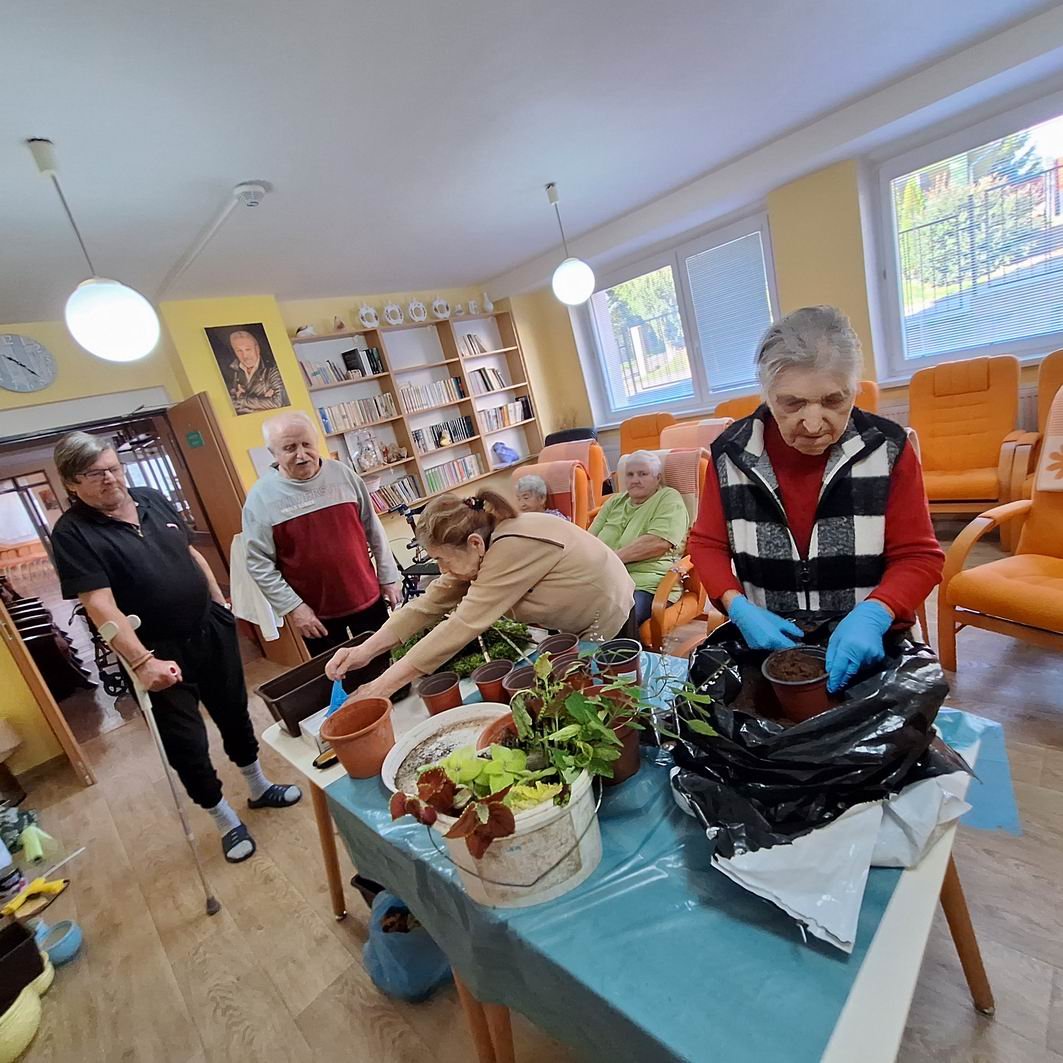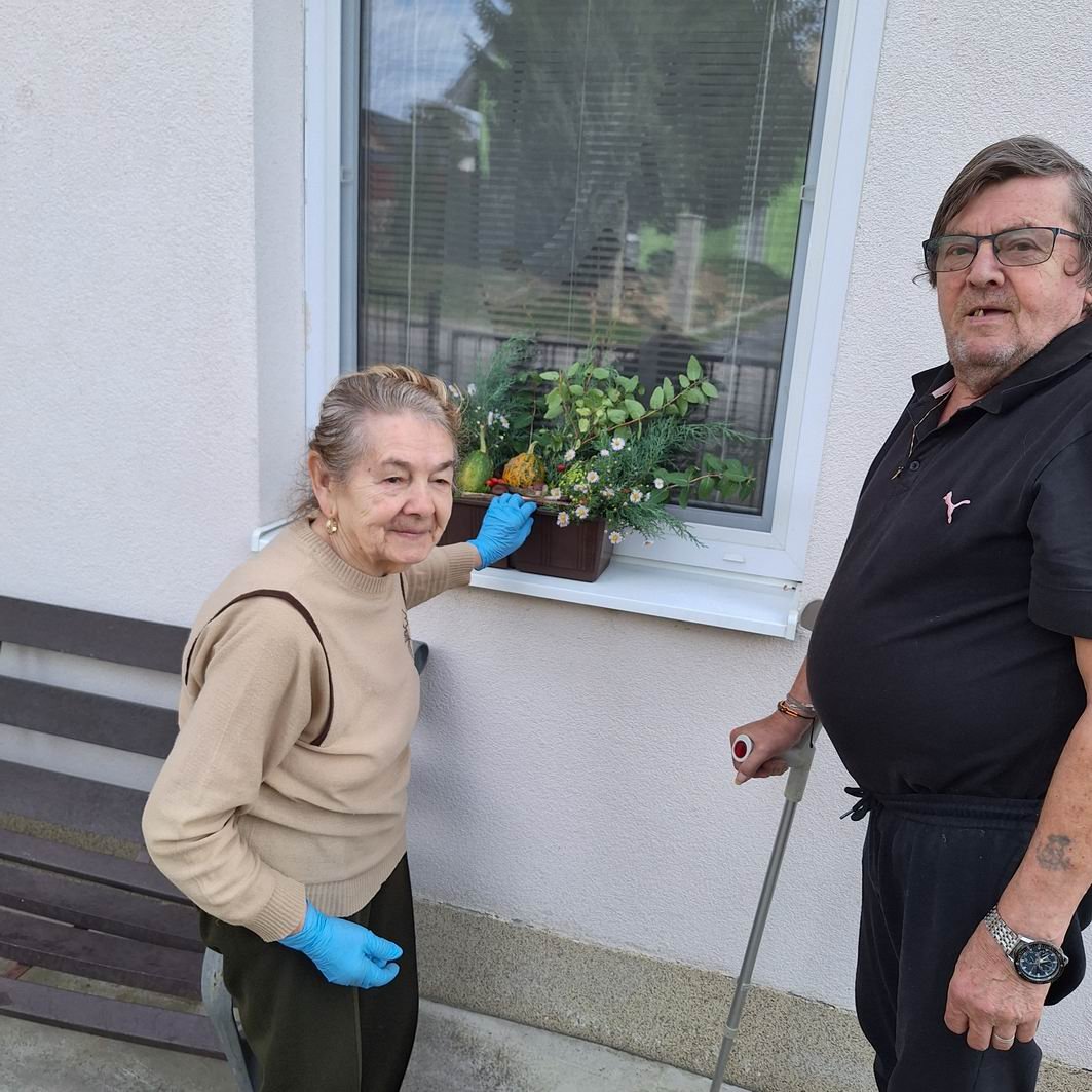 Jeseň pani bohatá, farbí listy dozlata. Viaceré naše seniorky si ešte stále pamätajú rôzne básničky o jeseni, ktoré sa kedysi pomáhali učiť svojim vnúčatám. Jeseň sa asi každému z nás spája s pestrosťou farieb v prírode. A aj naši seniori si chceli spestriť interiér i exteriér v našom zariadení, tak si dohodli spoločnú pracovnú aktivitu s našou novou inštruktorkou sociálnej rehabilitácie Jankou. Janka všetko pozháňala, nachystala a naše ženy už potom sadili, ukladali, aranžovali. Aj chlapi sa k nim pridali, niečo prichytili, niečo preniesli a spoločnými silami a hlavne s úsmevom na tvári skrášlili priestor pred vchodom do budovy i vstupný vestibul. Bolo pri tom veľa smiechu – chlapi radili, ženy im oponovali, no nasmiali sme sa jedna radosť. A výsledok určite stojí za to!