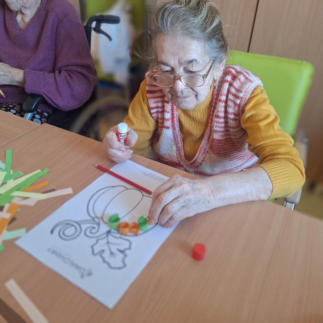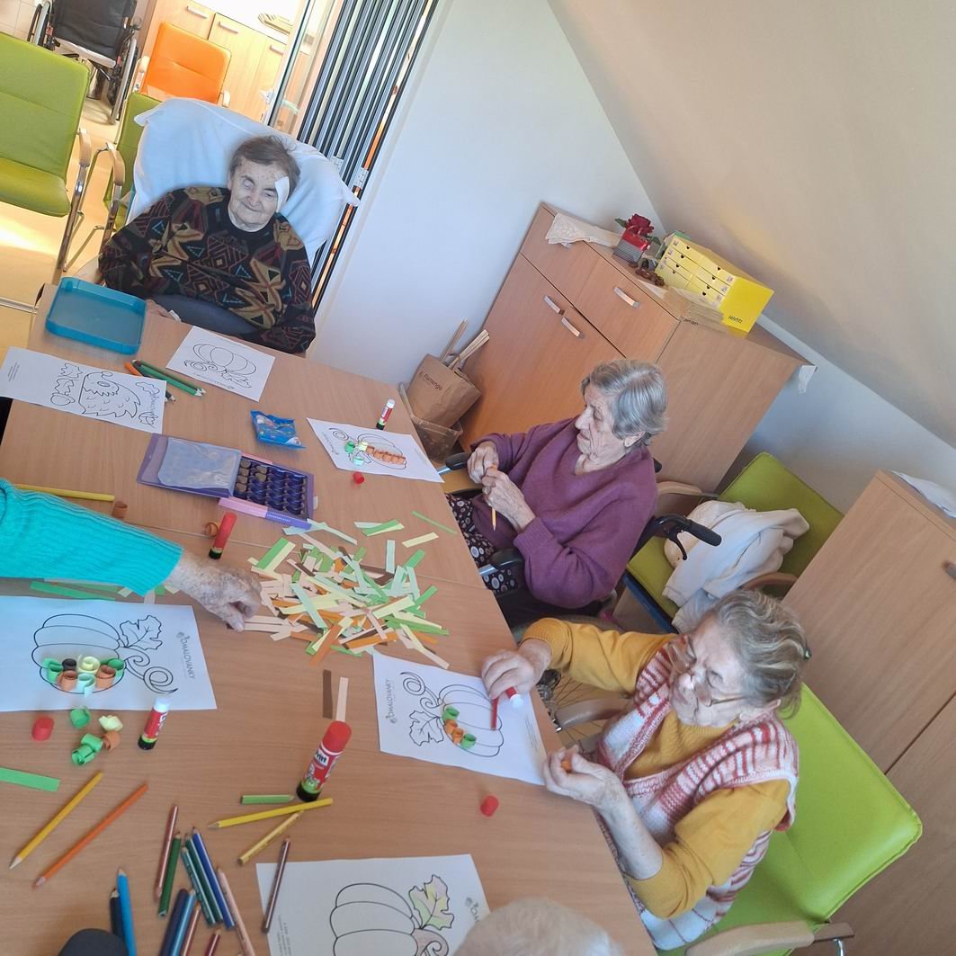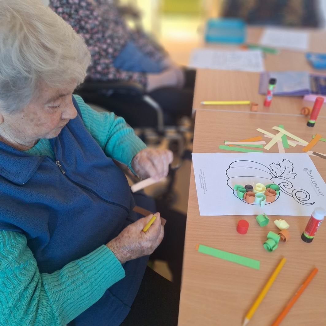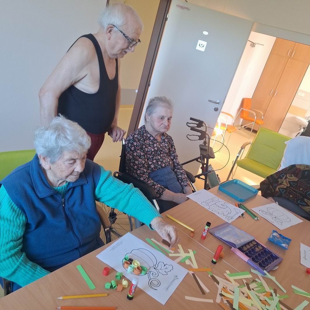 Obľúbenou aktivitou v našom zariadení sú aj tvorivé dielne. V rámci niektorých tvorivých dielní pracovali naši klienti hlavne s rôznym druhom papiera – hrubým kartón, s farebným papierom, krepovým papierom. A potom už len maľovali, strihali, šúľali, zatáčali, lepili. Výsledkom boli papierové tekvičky, ktoré sme si vystavili vo vstupnom vestibule. Iný deň zasa prekreslené tekvičky vymaľovali, ale taktiež vyzdobili zatočeným farebným papierom. Tieto obrázky sme zasa mali vystavené na stenách pri schodišti. A naši klienti sa už dnes tešia, čo budú zaujímavé vytvárať na budúcom tvorivom stretnutí. A my ostatní sme už tiež zvedaví a tešíme na na nové výtvory.